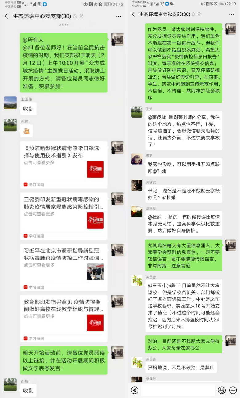 生态环境工程技术研发中心于2020年2月11日上午10:00通过微信的形式开展了“众志成城抗疫情”线上主题党日活动,活动由生态环境中心党支部杜娟主持,全体党员同志参加了本次活动。