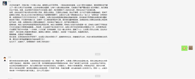 陈灵晶同志这段肺腑感言,表达了疫区同胞众志成城抗击疫情的信心和决心,另外一名身在疫区的彭若斯老师也表达了自己的想法。他表示身处重灾区,目睹了疫情的发生到愈趋严重,目睹了湖北部分官员的渎职,目睹了湖北红十字会的不作为,目睹了谣言满天飞和口罩等价格哄抬,这次灾难他意识到一个我们国家在行政和社会治理上面临的诸多挑战,意识到我们党执政的艰辛。从另一方面,也看到了我们党一切为了人民福祉的坚定决心,看到了无数共产党员冲锋在前的勇敢事迹。一批批党员先锋队冲在了疫情最需要的第一线,医疗冲锋队、基建冲锋队、党政冲锋队,这些基层党员的先进性和党员的先锋带头作用,让他在寒冬里热泪盈眶,对党和国家战胜疫情充满希望。