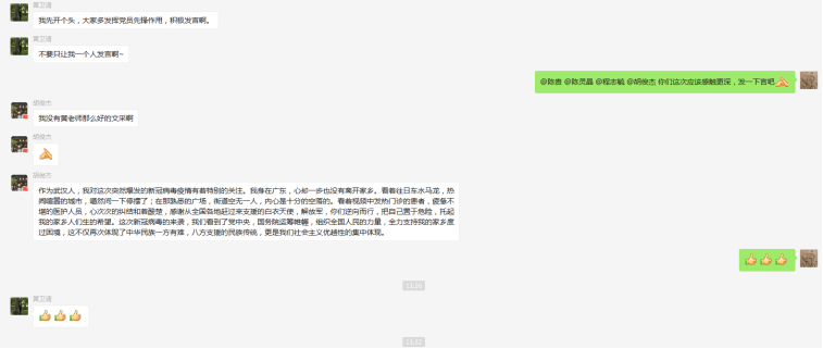 接下来接下来张敏同志发表了在疫情期间,作为一名大学老师,如何看待自己的职责。她表示1、要及时将学校关于新型冠状病毒肺炎疫情防控工作的通知精神传达给学生,并通过电话、微信、QQ等各种方式及时准确掌握学生的假期动向和身体状况,督促学生配合学校做好健康日报工作。 2、引导学生理性科学地看待疫情,通过官方权威途径获取信息和防控知识,不造谣、不信谣、不传谣,不在网络上发布未经证实的相关信息,消除焦虑、恐慌情绪。 3、随着战“疫”时间增长,开学时间迫不得已会延长,教育部通知要“停学不停课”,我们要充分利用线上的慕课和省、校两级优质在线课程教学资源,依托各级各类在线课程平台、校内网络学习空间等,加强学习,提升教学技能,积极开展在线教学活动,保证疫情防控期间教学进度和教学质量。吕小梅老师表示我们共同经历了种种复杂心情。疫情仍在持续蔓延,但不时也会有好消息:每日新增病例正在减少,疫苗研发逐步推进,病毒菌株成功分离,各地救援团队驰援武汉,治愈病例不断增多,防控物资进入绿色通道,等等。对于我们普通人,我们需要保持信心,做好防护,相信科学,相信国家,斥责谣言、坚持在家不出门、不添乱,就能为抗击疫情做出的贡献。第一声春雷已炸响,武汉的春天、湖北的春天、祖国的春天马上就会到来,让我们共同期待春暖花开。群里的各位党员都积极发表了自己在国家这个特殊时期的心情,对武汉同胞的关切,对党的信任和战胜疫情的强大决心。