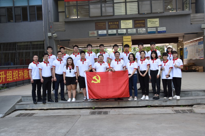 正门口集合,以高昂的精神风貌与党旗合照,整装待发。