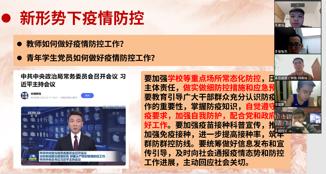 对于东莞理工学院紧急征用学生宿舍这件事情,党员同志们积极发表自己的看法,表示对于学校征用宿舍这件事请表示理解并感到自豪,疫情当下每个人应及自己所能为社会、国家做出贡献;对于一些学生冲动的行为表示不支持,认为大家应互相理解。最后,党员表示自己会积极响应学校的号召,严格遵守各项疫情管理规定,落实学校疫情防控要求。