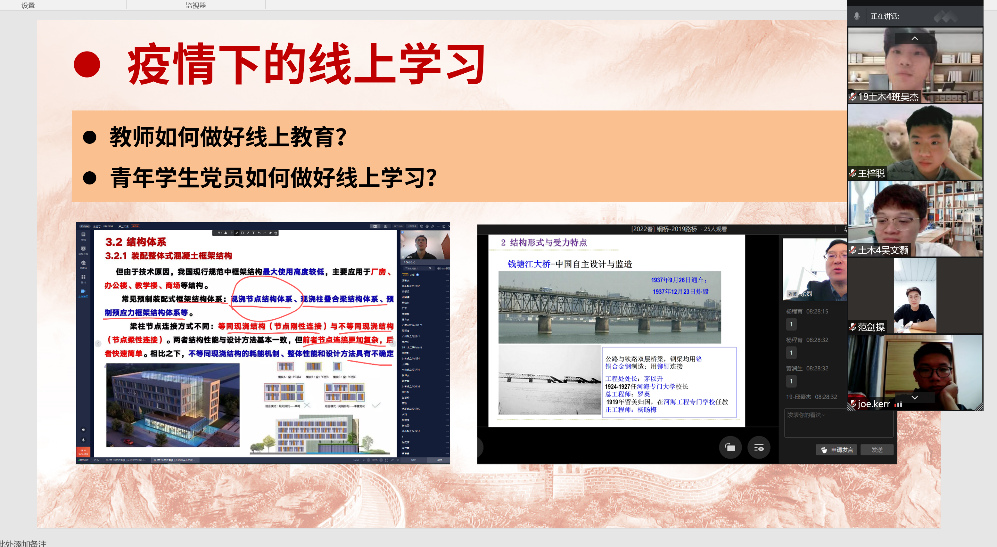 何春灿同志、庞书孟同志作为教师党员,认真分析了线上上课的利弊,并表示以后会更加注重线上上课的质量,给学生做良好的示范。杨程育同志,曾凯城同志等作为学生党员代表,也表达了自己对线上上课的看法,简述了线上上课的优缺点,并表示自己以后会严格要求自己,提高上课学习的效率。