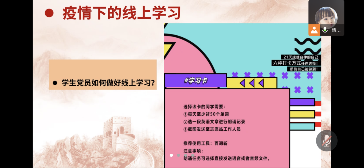 在教育教学大讨论环节,各位党员积极思考,主动献言献策,并结合自身经验和判断分别提出了许多宝贵的意见。教师结合自身的教学科研工作,展开了研讨交流,分享了学习体会。学生党员结合疫情下的线上学习,提出了学习存在的问题和挑战,同时也发表了线上学习的一些看法,并通过“新青年”党建工作室发出了线上自律学习的倡议书。