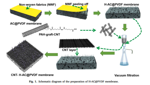 陈忠明博士等人通过引入PAH改性碳纳米管用于膜表面,改性后的碳纳米管具有超亲水性能超疏油性能,从而可以实现在油水分离的同时有效去除微量重金属。下图为复合膜的制备示意图。