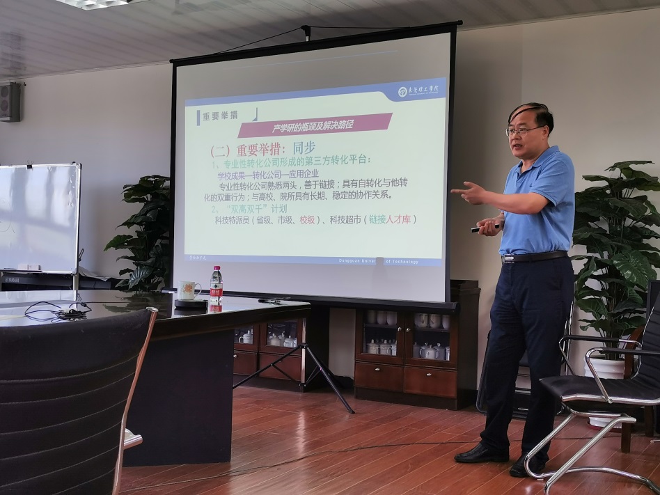 范洪波处长对目前我校科研概况、东莞理工学院科技成果育成中心和科技超市网上服务平台的运转情况进行了介绍;对目前我校产学研的瓶颈等问题进行了深入的剖析,指出企业有需求找不到解决方案,科研机构不了解市场,缺乏专业机构的牵线搭桥,让科技成果“卡”在实验室,这些关键是“脱节”问题。同时提出了重要措施“同步”,包括专业性转化公司形成的第三方转化平台的搭建和“双高双千”计划的实施。演讲结束后,范洪波处长与环建教师们进行了充分的交流,听取了老师们的建议和意见。