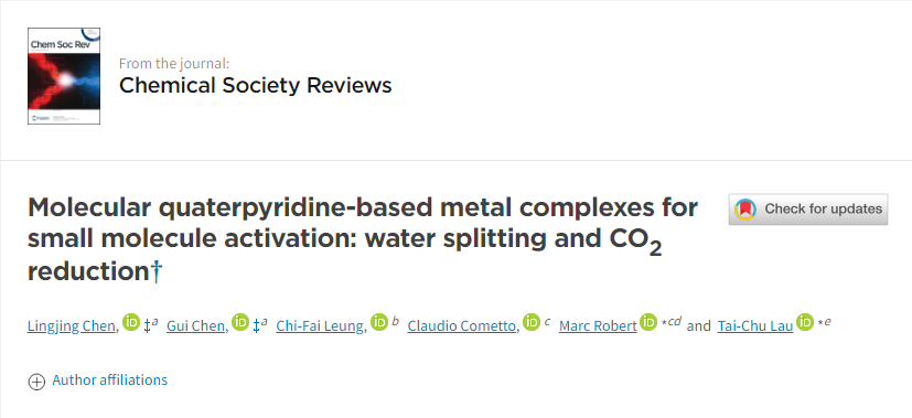2020年9月,陈灵晶、陈贵博士与香港城市大学刘大铸教授和法国巴黎大学MarcRobert教授合作在国际顶级期刊《Chemical Society Reviews》上发表综述论文。《Chemical Society Reviews》是英国皇家化学会发行的一本国际顶级期刊,影响因子42.8。该成果以东莞理工学院cgpay钱包