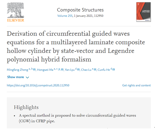 郑明方博士后在《Composite Structures》发表题为“Derivation of circumferential guided waves equations for a multilayered laminate composite hollow cylinder by state-vector and Legendre polynomial hybrid formalism”的论文。郑明方博士后为第一作者,合作导师马宏伟教授为通讯作者。该项工作解决了传统矩阵方法无法求解各向异性多层柱状结构周向导波特性的难题,同时也突破了传统勒让德多项式方式在求解多层柱状结构要求层间材料力学参数相近的限制,克服了应用传统勒让德多项式方法来处理界面位移和应力连续条件时所带来的挑战,求解了粘弹性/弹性碳纤维管的导波特性和频散特性,为复合管周向超声导波检测技术奠定了理论基础。