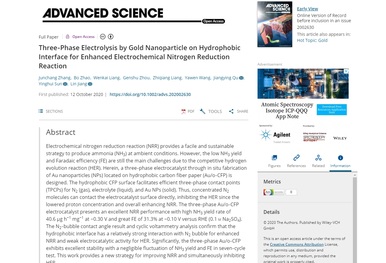 该工作以“Three‐Phase Electrolysis by Gold Nanoparticle on Hydrophobic Interface for Enhanced Electrochemical Nitrogen Reduction Reaction”为题发表在《Advanced Science》。《Advanced Science》是Wiley旗下发行的国际著名期刊,影响因子为15.8,属于中科院一区TOP期刊。该成果以东莞理工学院cgpay钱包