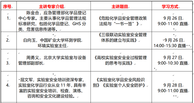 本次培训采取“在线直播+视频录课”相结合方式进行。此培训由应急管理系统、公安系统、环保系统、高校、医院、知名安防企业在内的专家授课,本期在线培训将设置20余场专家授课,可在2个月内回放。
