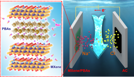 探索和设计高性能法拉第电极材料对提高杂化电容去离子(HCDI)的脱盐性能具有重要意义。尽管当前研究出许多法拉第电极材料,但是因各自所存在的不足,所得到的脱盐性能不尽理想。因此,通过简单真空抽滤的方法得到开放,独立的MXene与普鲁斯兰类似物的复合膜(MXene/PBAs,即MXene/NiHCF和MXene/CuHCF),可直接作为HCDI电极。高导电性的MXene纳米片与PBAs纳米颗粒桥接形成三维导电网络结构,可以加速盐离子和电子扩散/输运动力学。此外,PBAs纳米粒子可以防止MXene纳米片的堆积,扩大其层间间距,并有利于离子的快速扩散和存储。基于MXene和PBAs双赝电容脱盐效应,所得的复合膜展现出了优异的脱盐性能(MXene/NiHCF和MXene/CuHCF的脱盐量分别可达85.1 mg g-1和80.4 mg g-1)。本文为独立的HCDI电极的设计提供了一种简便易行的方法,有利于促进HCDI技术的快速发展。