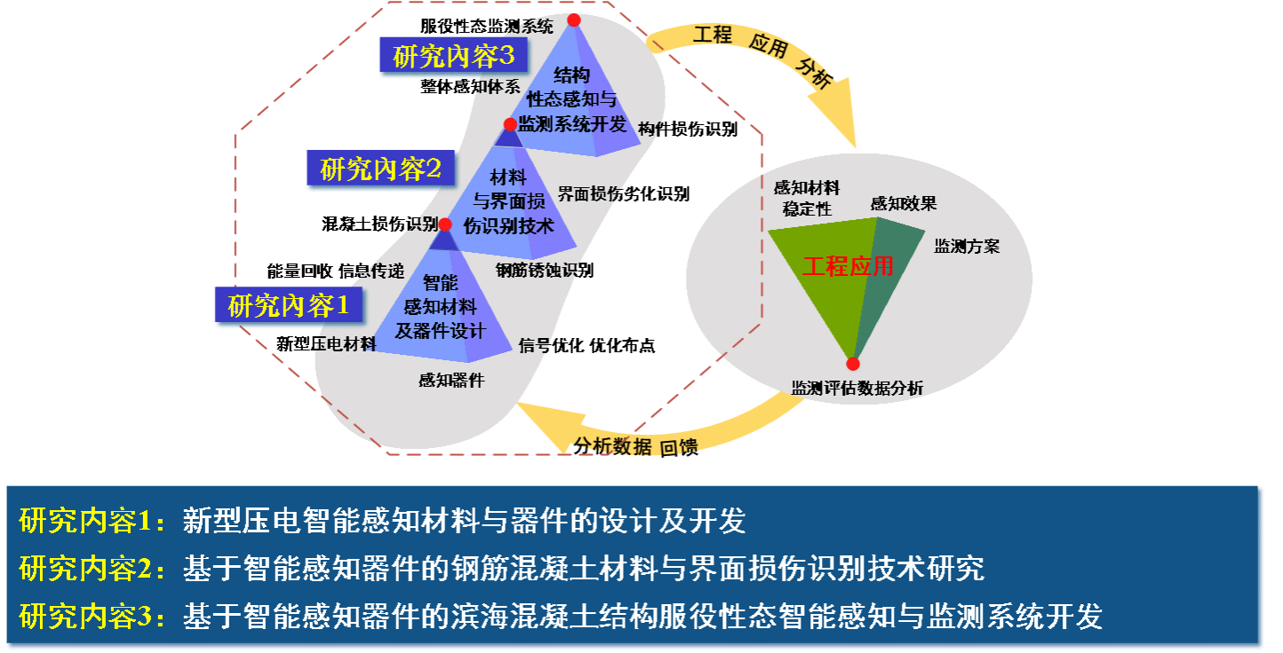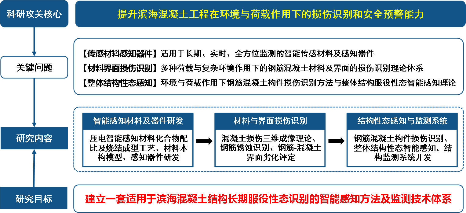 项目聚焦:(1)新型压电智能感知材料与器件的设计及制备;(2)基于智能感知器件的钢筋混凝土材料与界面损伤识别技术研发;(3)建立滨海混凝土结构服役性态智能感知理论;(4)搭建滨海重大混凝土工程长期服役性态监测系统,助推研究成果产业化。