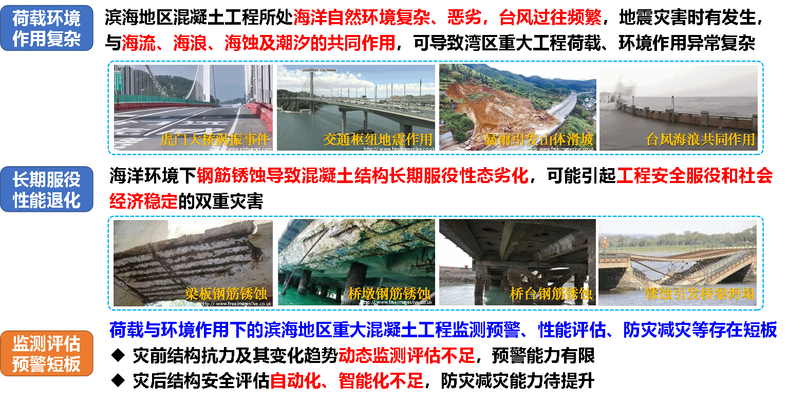 本次粤澳联合创新项目从滨海重大混凝土工程安全运维出发,以结构长期服役性态智能感知和监测技术为研究对象,以确保滨海环境重大混凝土基础设施在荷载及环境等多因素耦合作用下的工作性能安全诊断为驱动,最终以滨海混凝土结构长期服役性态智能感知器件研发、结构损伤识别技术建立与工程应用为核心目标。