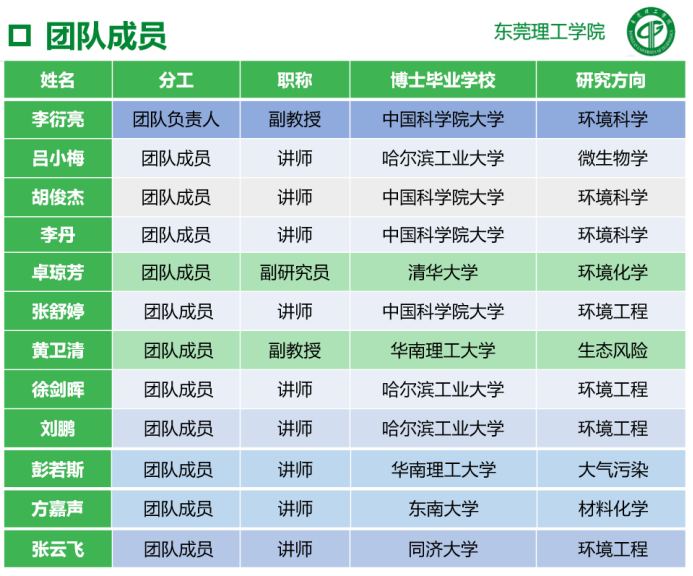 学院建设,成立于2019年4月,目前研究人员12人,高级职称3人,讲师9人,全部为博士。团队负责人李衍亮,毕业于中国科学院大学,担任环境科学与工程系系主任,副教授,硕士研究生导师。
