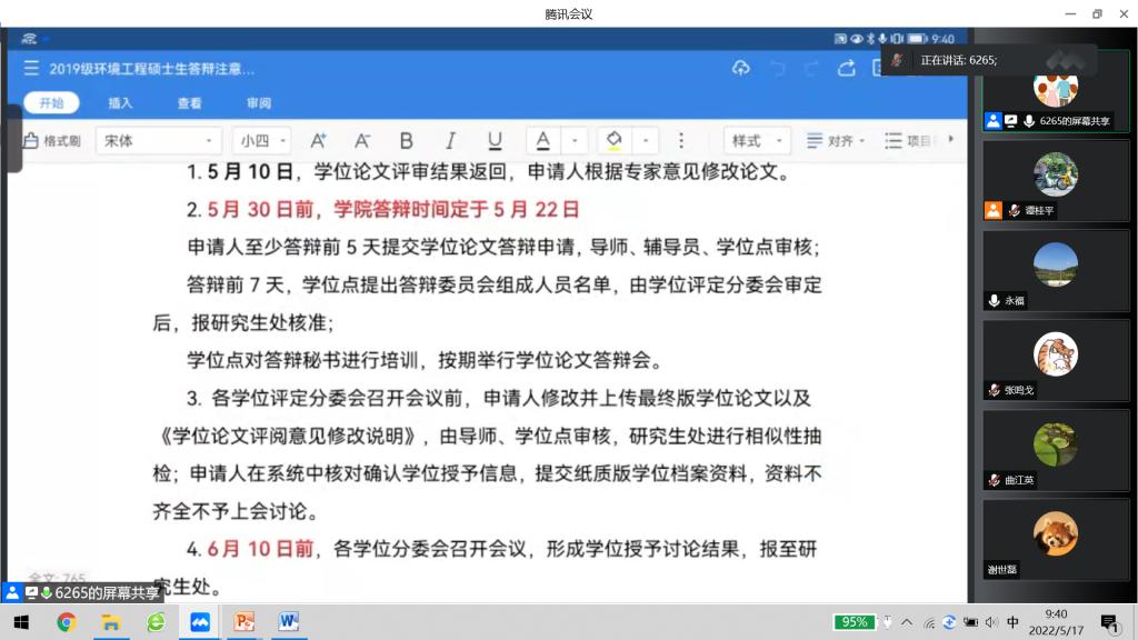 2022年5月17日,cgpay钱包 举行了2019级环境工程专业硕士研究生毕业答辩动员会。cgpay钱包 副院长邱永福教授和谭桂平副教授,研究生处宋雪晶博士和胡旖冉博士,及2019级研究生参加此次会议。邱永福副院长首先介绍了硕士研究生学位论文答辩基本程序与注意事项,张文涛老师详细讲解了硕士学位论文答辩与学位申请所需的材料清单及其填写要求,宋雪晶博士对毕业答辩要求进行了相关补充,并预祝此次答辩会顺利进行。