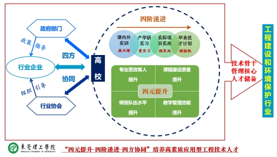始终以培养、输送具有创新精神和实践能力的高素质、应用型工程技术人才为职责,打破拘囿、开拓创新,以教学质量为生命线,不断深化教育教学改革,实践育人,创新育人,构建了“四元提升、四阶递进、四方协同”的地方应用型工程技术人才培养体系,并经过多年实践和推广应用,形成了鲜明的人才培养特色,推动我校工程建设和环境保护等领域工程技术人才培养质量显著提升。