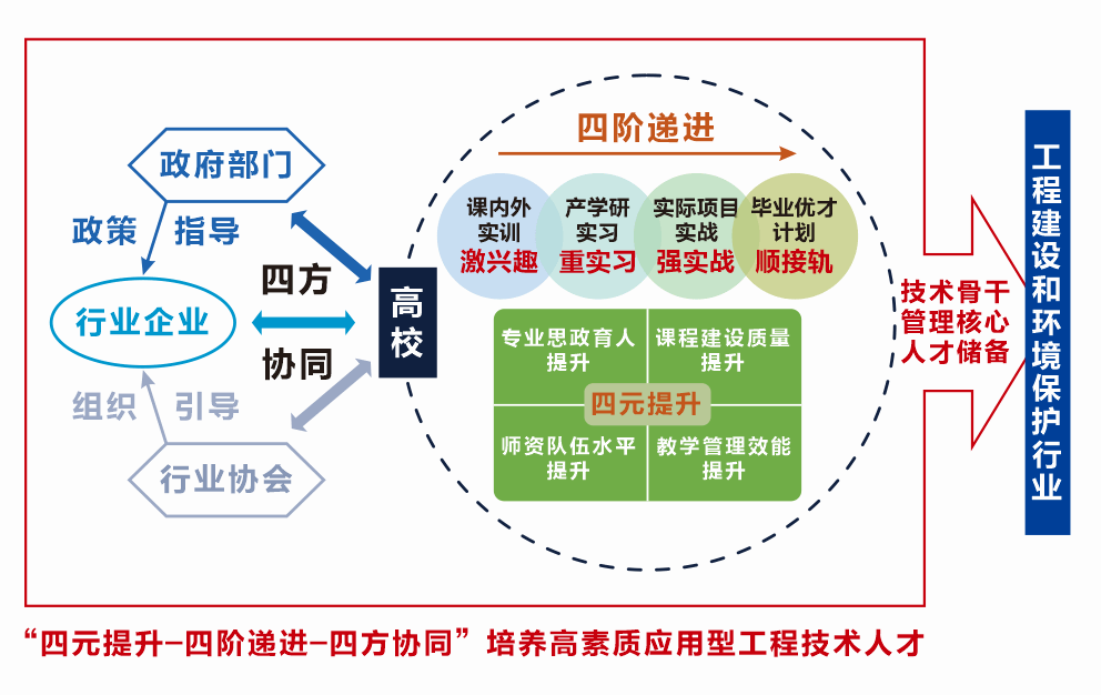 始终以培养、输送具有创新精神和实践能力的高素质、应用型工程技术人才为职责,打破拘囿、开拓创新,以教学质量为生命线,不断深化教育教学改革,实践育人,创新育人,构建了“四元提升、四阶递进、四方协同”的地方应用型工程技术人才培养体系,并经过多年实践和推广应用,形成了鲜明的人才培养特色,推动我校工程建设和环境保护等领域工程技术人才培养质量显著提升。