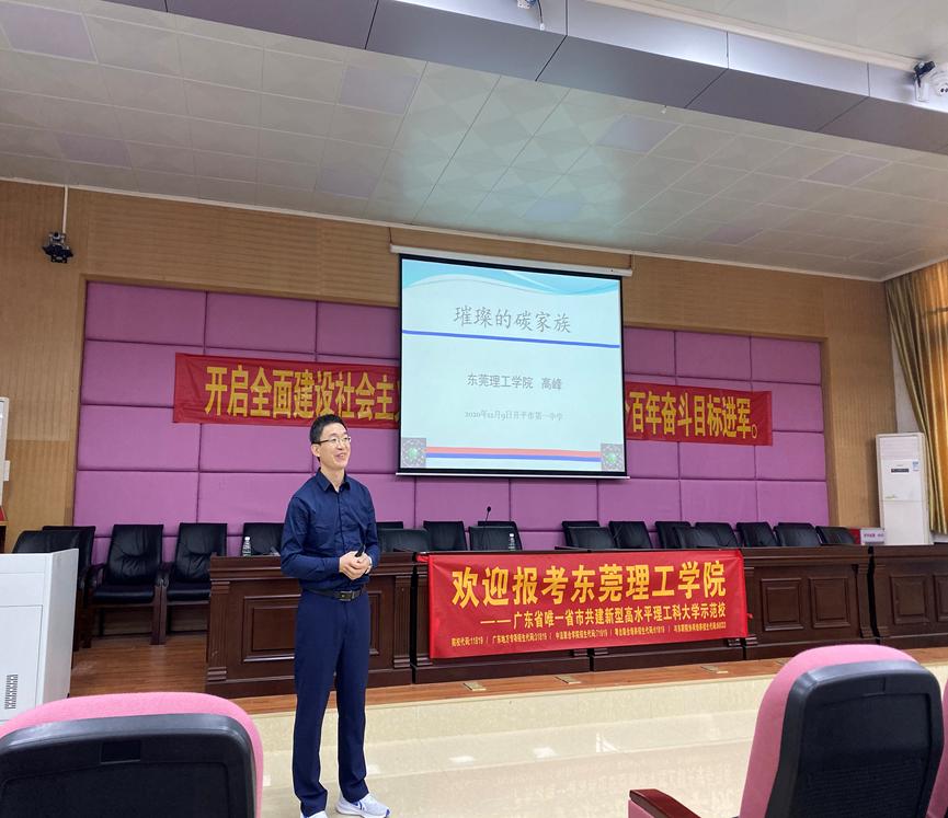 高峰副教授以《璀璨的碳家族》为题,分别为开平市第一中学、开侨中学学生带来主题为《璀璨的碳家族》的讲座。讲座主要介绍了碳元素的集中同分异构体,如金刚石、石墨、石墨烯、富勒烯。依照“结构-性质-用途”为线索,介绍其结构特点、性质以及主要应用,并将发现历史故事穿插其中,科学思想和科学方法贯穿始终。同时,激励同学们不畏艰难,勇于探索。