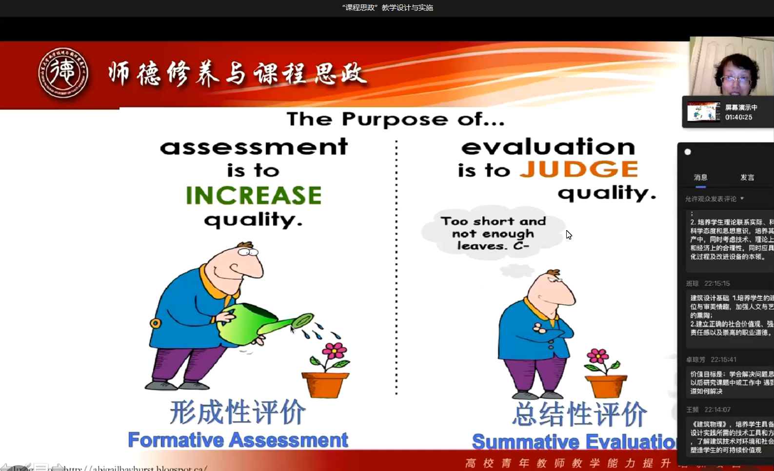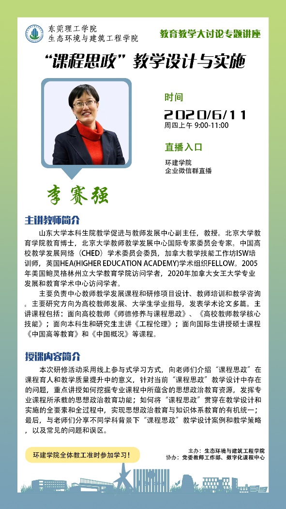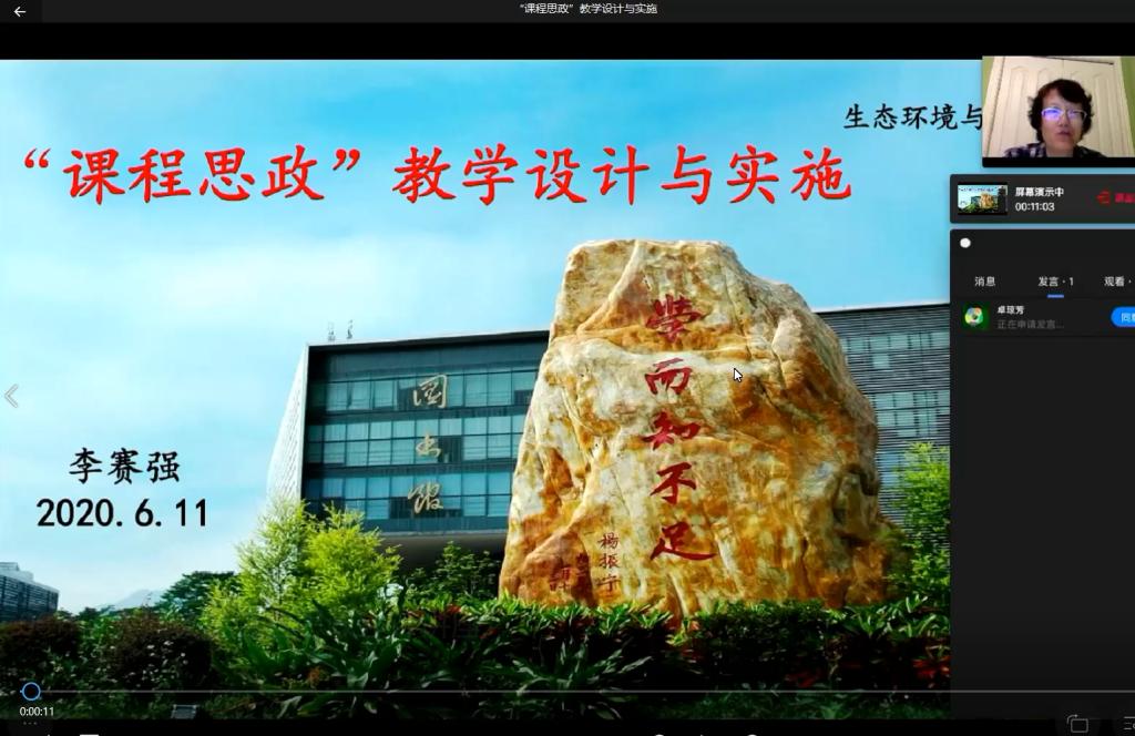 今年教育教学大讨论的重点工作之一 “绿水青山就是金山银山”系列主题课程思政教学案例征集活动奠定了坚实的基础。在本学期结束前,学院将遴选出多门优秀的课程思政教学案例,并邀请李赛强教授通过云会议的形式给予逐一点评指正。待教学案例修改完善后,进一步通过视频录制的方式固化成果并推广。