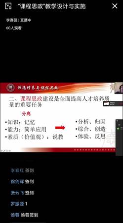 李教授在2个小时的讲座过程中,引经据典,结合了丰富的实践案例,从“课程思政”建设的背景意义入手,深入浅出地讲解了课程思政资源挖掘的策略,以及如何有效提升课程思政教学设计的有效性,同时,还积极引导老师们反思如何能提升课程思政的意识和能力。