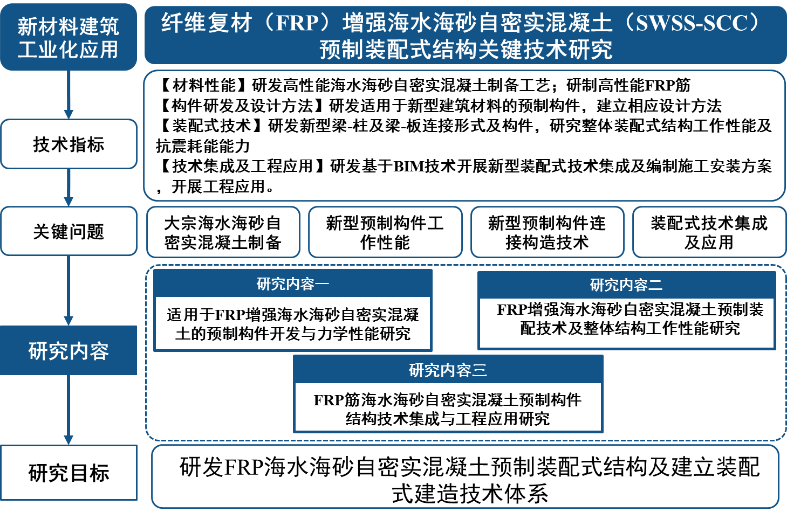 本次粤港联合创新项目从资源的可持续性和生态环境保护出发,以纤维复合筋海水海砂自密实混凝土预制构件及装配式结构为研究对象,以开发适用于新型建筑材料预制构件和具备良性工作性能装配式建造体系为驱动,最终以新型预制构件设计方法、装配技术应用以及技术集成与工程应用为核心目标。