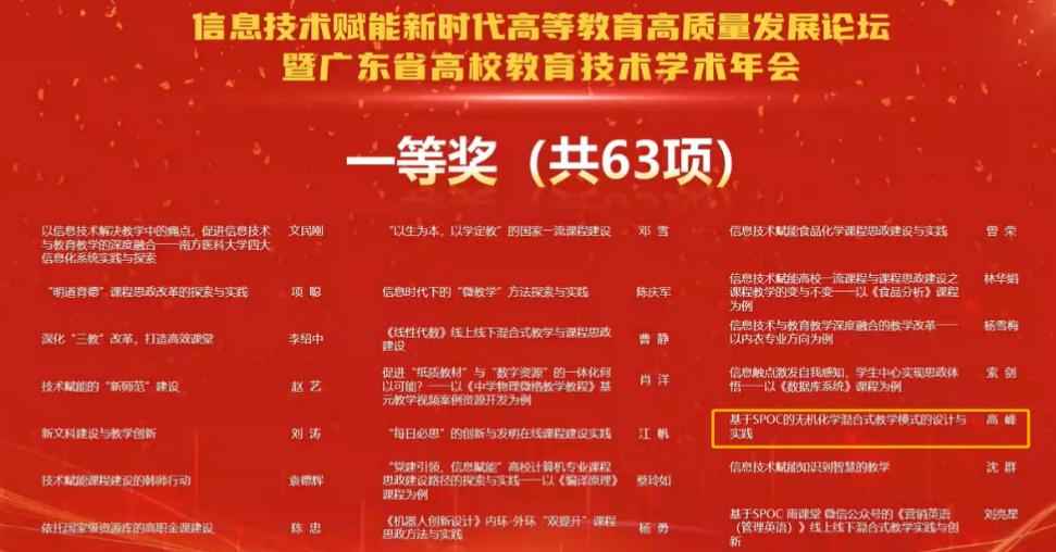 孙璨、高峰两位老师受邀分别在经管法分会场、理工分会场做了题为“混合式学习环境中以学习分析为纽带构建线上学习共同体促进学生深度学习”、“基于SPOC的无机化学混合式教学模式的设计与实践”的专题报告,充分展现了我校在混合式教学研究改革中的优秀成果及宝贵经验,受到与会专家和参会人员的广泛关注和好评。同时,两人均代表我校获得由广东省本科高校在线开放课程指导委员会评选出的“教学改革创新优秀案例”一等奖。