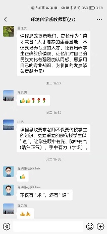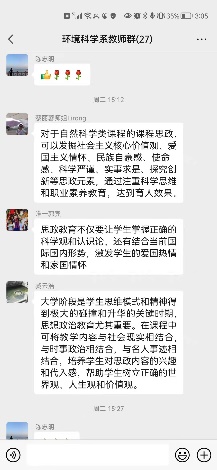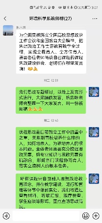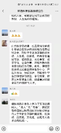 为全面贯彻落实全国高校思想政治工作会议和全国教育大会精神,把思想政治工作贯穿教育教学全过程,实现全程育人、全方位育人,把立德树人内化到课堂教学和课外教学活动之中,使“课程思政”落地落实,环境科学系全体教师针对思政课在专业课程中的重要性进行了热烈探讨,促进了老师们对课程思政的理解,并更好地在课程中融入思政内容。