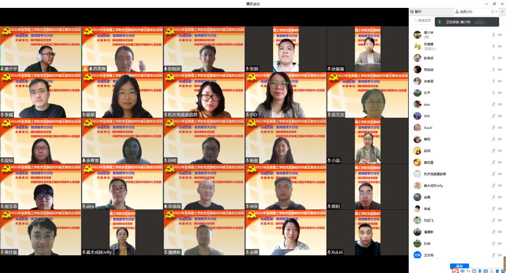 为深入学习贯彻习近平总书记关于教育的重要论述和系列重要讲话精神,贯彻落实学校《东莞理工学院深化课程思政建设实施方案》、《关于开展“深化课堂教学改革 提升课程育人质量”教育教学大讨论的通知》精神,提高人才培养质量,3月25日,生态中心(以下简称“中心”)党支部通过与党委组织部联合党支部结对共建,在腾讯会议平台组织了主题为“研究生培养的思政探讨——春风化雨”的线上主题党日活动。本次活动由党委组织部联合党支部书记彭晓波同志主持,共分为四个部分:一是“第一议题”学习;二是党委组织部联合党支部谈对教育教学大讨论的理解和对中心党支部的希望;三是中心党支部结合工作实际,谈对研究生培养思政工作的理解;四是会议总结。中心22名党员和3名拟发展人员以及党委组织部联合党支部10名党员到会参加。