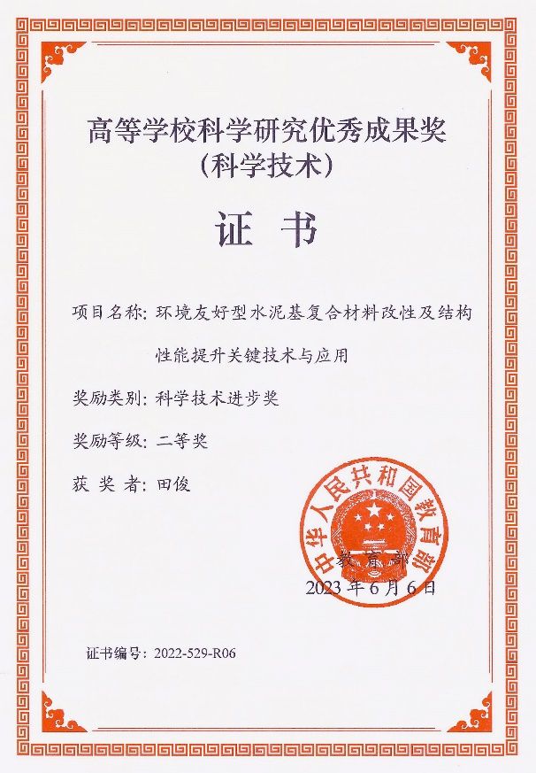 特聘教授田俊老师荣获2022年教育部高等学校科学研究优秀成果奖(科学技术)二等奖;获奖项目名称为:“环境友好型水泥基复合材料改性及结构性能提升关键技术与应用”。