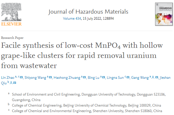 王刚教授课题组2019级硕士研究生赵霖在开发高效铀吸附治理含铀污水方面取得进展,研究成果以第一作者身份以“Facile synthesis of low-cost MnPO4 with hollow grape-like clusters for rapid removal uranium from wastewater”为题发表在环境领域国际知名学术期刊《Journal of Hazardous Materials》上。