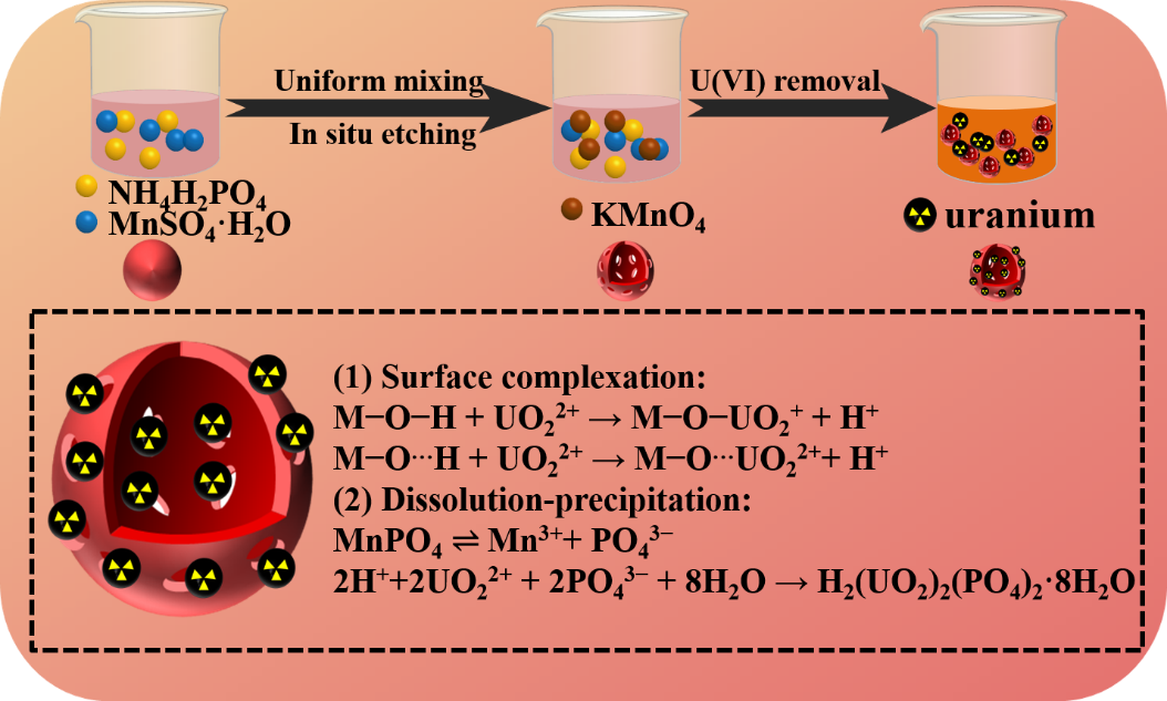 该研究通过湿化学法,利用原位刻蚀机制,在室温下快速合成了葡萄簇状的MnPO4中空 纳米球。该材料可以快速去除污水中的铀酰离子,具有751.88 mg g -1高吸附容量,并且在高盐度的废水中维持高去除率。通过XRD、XPS、FT-IR等手段证明了h-MnPO4与铀相互作用的机理为溶解-沉淀和表面络合协同吸附机理。该研究结果为含铀污水的应急处理提供了新的选择。