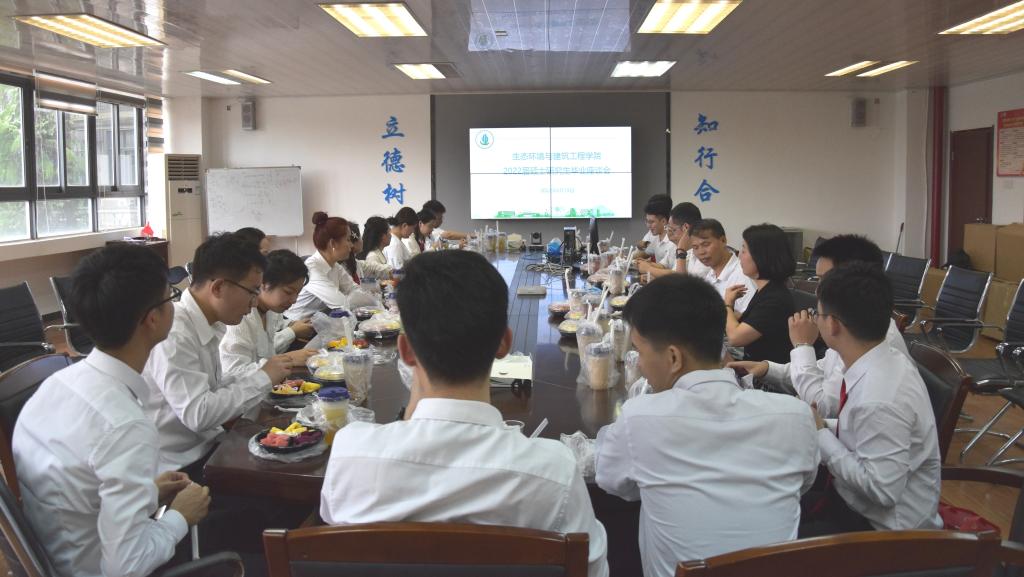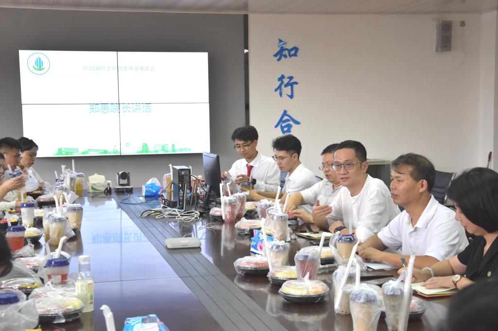 党委书记李纠、院长郑愚、副院长邱永福、党委副书记诸小妮,以及2022届硕士毕业生,座谈会由研究生辅导员胡胜老师主持。